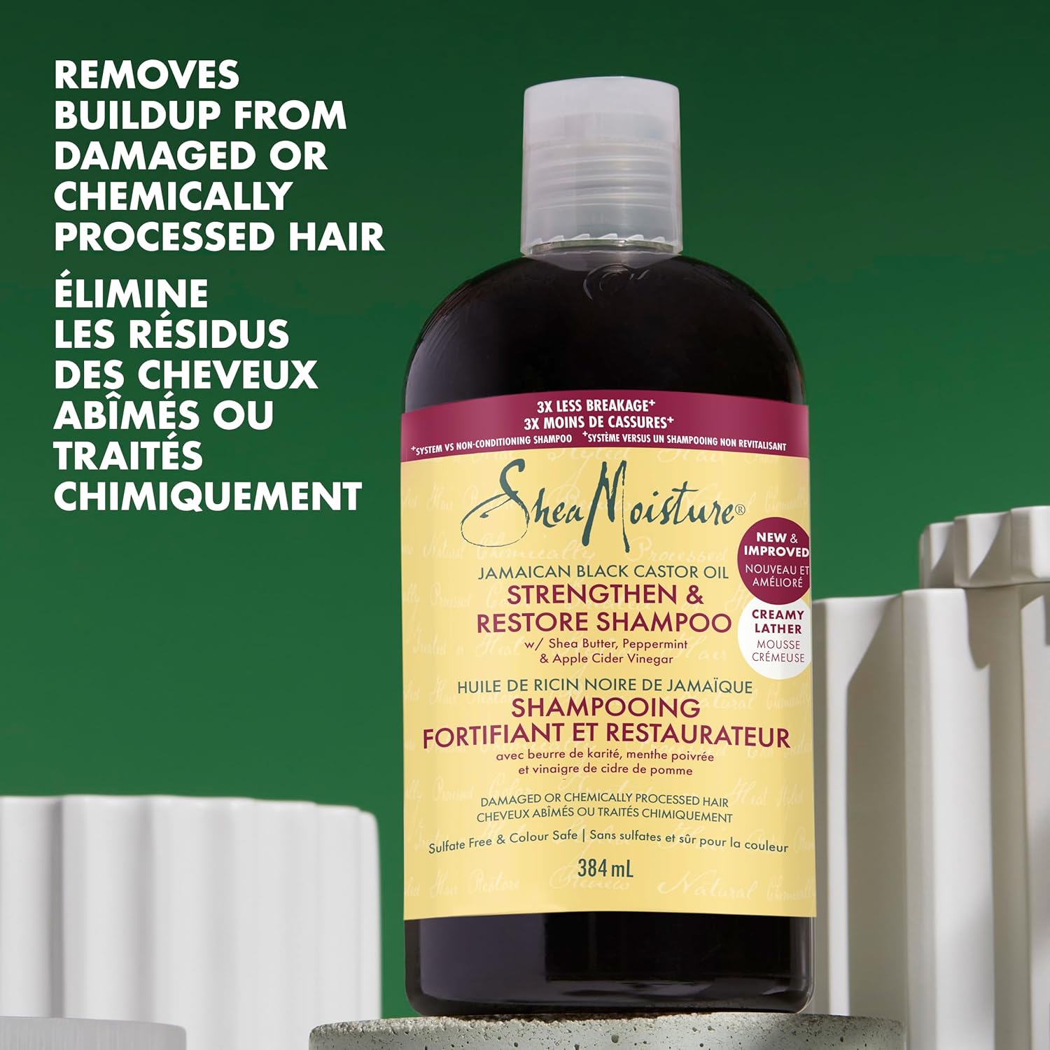 - The SheaMoisture Jamaican Black Castor Oil Strengthen & Restore Shampoo, now with a NEW & IMPROVED formula, gently cleanses with a creamy lather